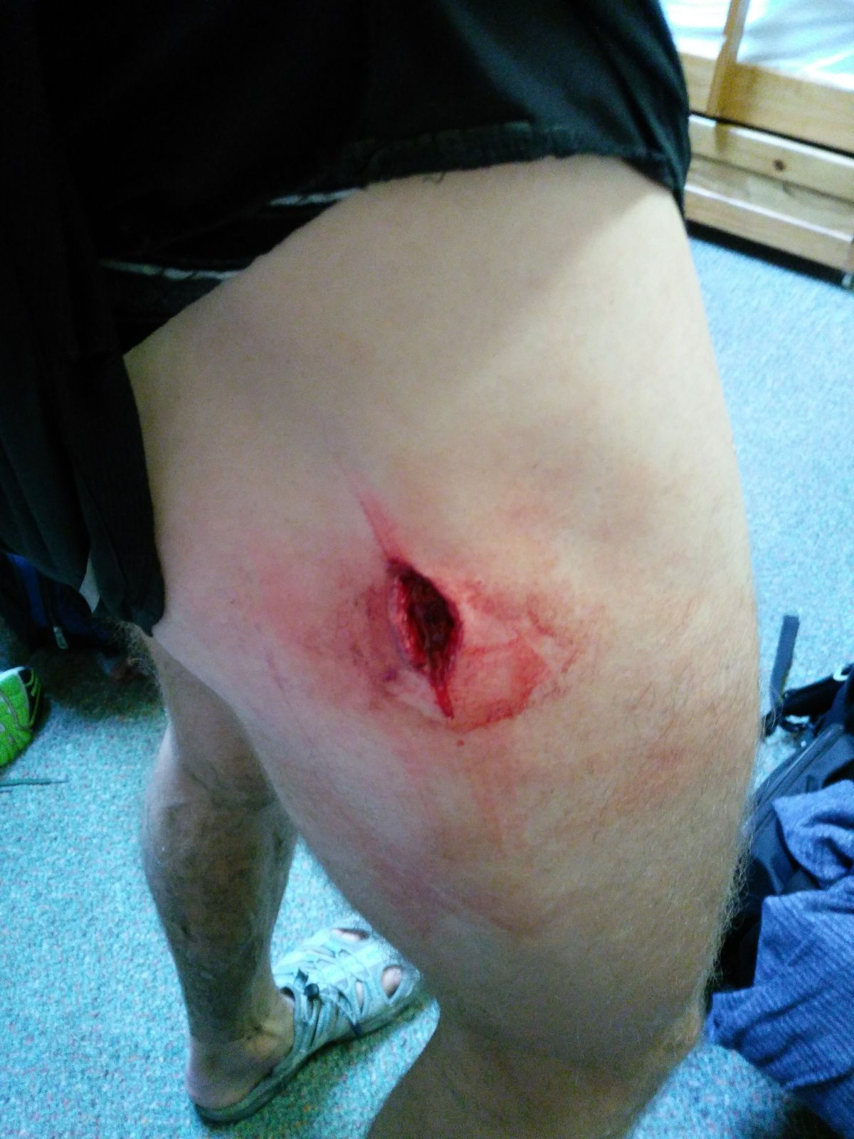 Thankfully Simon did not realise he had done this to himself until he had completed his leg . The injury the result of slipping on the almost frictionless wet grass whilst speeding downhill. A detour to Penrith Hospital for some stitches was required on the way home.